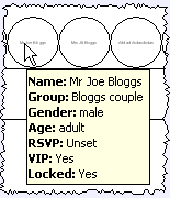 The Auto layout window should disappear after a few seconds. If you look at the Floor plan pane you should see that all seats now have guests assigned. If you hover the mouse cursor over a seat the details of the guest assigned will be displayed: