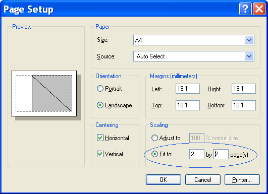 Under Scaling select Fit to and enter an appropriate number of pages across and down.